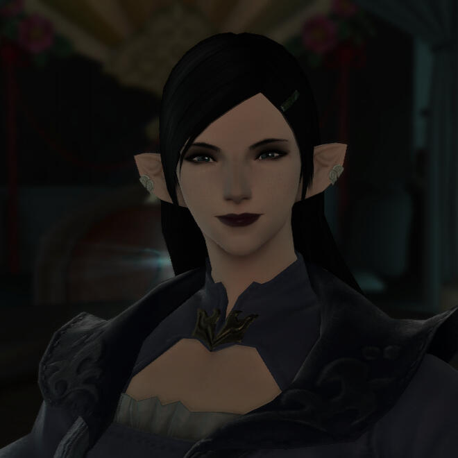 Madam Dubois is an Ishgardian beauty who puts great effort in her appearance, but isn't so narrowly focused on it that she grows shallowly vain.There is purpose to the manner in which she dresses and conducts herself, as her appearance is part of her profession.As a soothsayer, she likes the dramatics of dark make-up and dress to give her a hint of otherworldly mystique.As a paramour she adorns herself in a manner that celebrates curve and beauty, and is even known to dress in more risque, even scandalous, outfits in private settings.Maudine has a general love for dark make-up that pairs well with her raven locks and dark-green eyes, enjoys fashionable dresses and shoes and likes subtle but expensive jewelry.